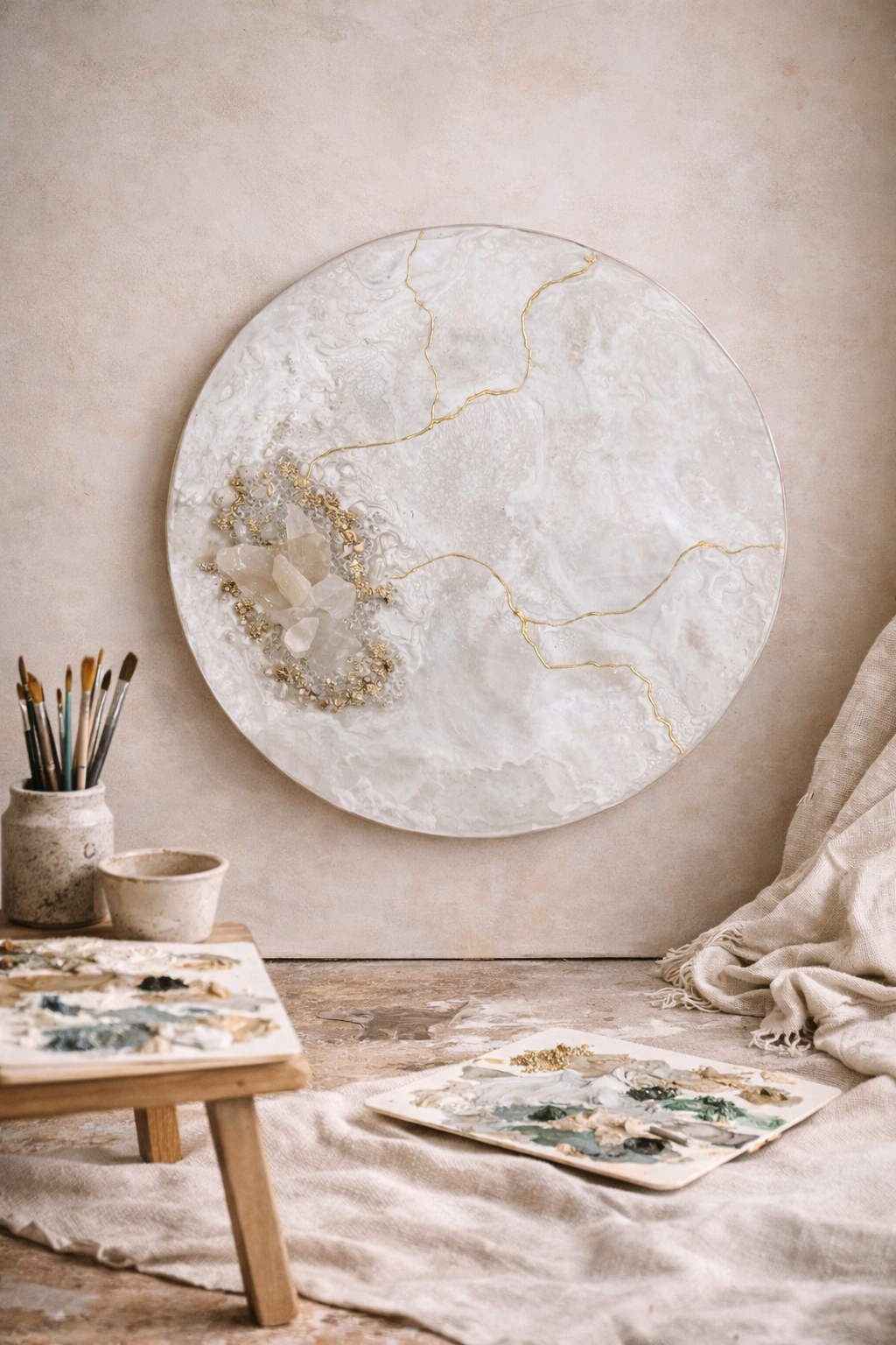 Softly Whole was created as a reflection of inner healing — the idea that growth does not need to be forceful to be powerful. Flowing neutral tones move gently across the surface, while delicate 9ct gold veins trace organic pathways, symbolising the beauty found in life’s natural cracks and transformations. At its heart, crystal clusters anchor the piece, representing stability, warmth, and clarity.