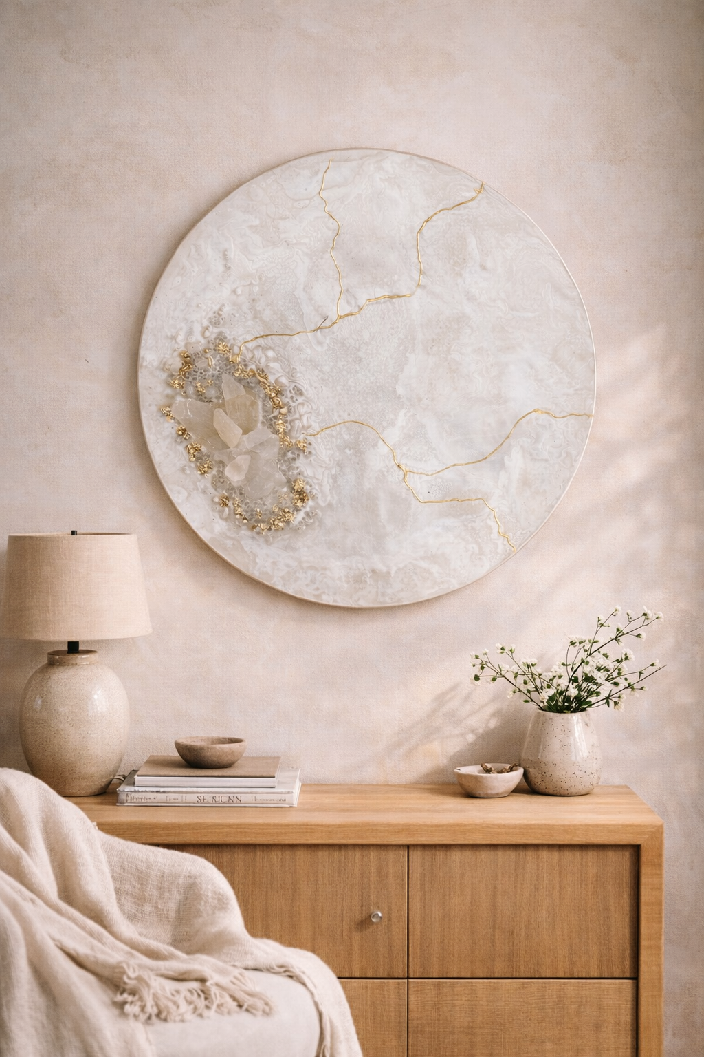 This artwork is created on a 30cm diameter circular base using layered resin techniques to achieve depth, movement, and a soft stone-like finish. Genuine Honey Calcite and Clear Quartz crystals are embedded into a geode-style formation, accented with hand-applied 9ct gold veins. Each piece is sealed with a protective gloss coating to preserve colour, texture, and energy.